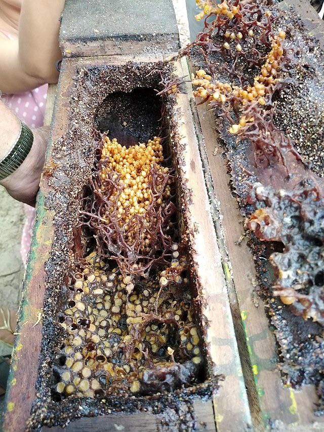 These bees do not collect pollen from flowers like most of their relatives. Instead, they ingest the flesh of dead birds, monkeys, lizards, snakes, and fish. Vulture bees have large, pointed teeth, which they use to break into a carcass through its eyes, just like maggots do. They slice off pieces of meat from the carcass and store them in their crops. Back at their nests, bees regurgitate the meat and mix it with honey. In about two weeks, the mixture turns into a paste rich with free amino acids, proteins and sugars. This nutritious pap is then fed to bee larvae.