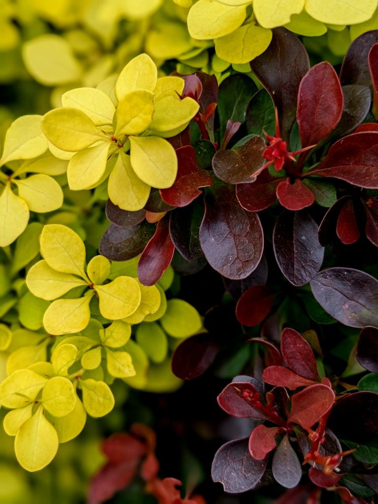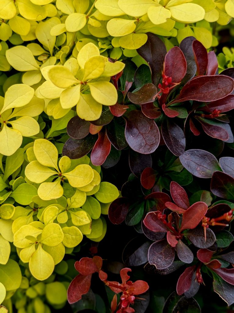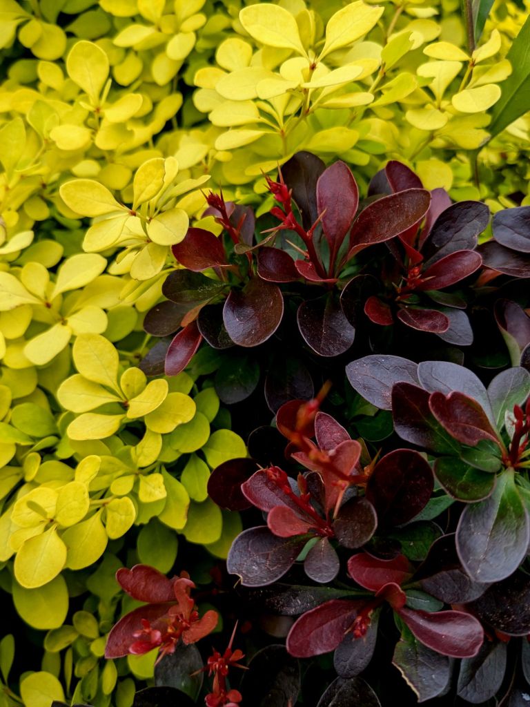 I saw these shrubs a few days ago and the intertwined colors made me stop and stare for a moment. Beautiful and captivating despite not being a flower. The planting of them side by side was a fantastic choice in landscaping and a wonderful color pop.