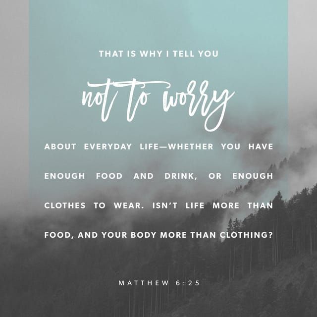 25 Therefore I say unto you, Take no thought for your life, what ye shall eat, or what ye shall drink; nor yet for your body, what ye shall put on. Is not the life more than meat, and the body than raiment?