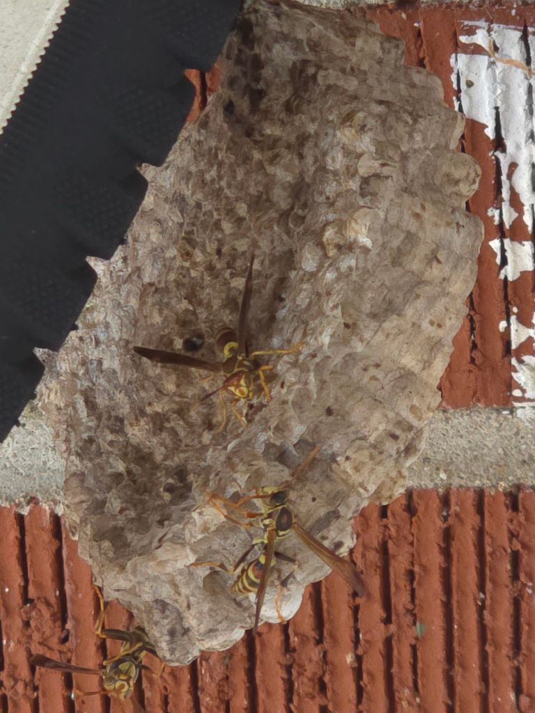 Paper wasps build their nests from chewed plant fibers mixed with saliva, creating a paper-like material. The nests have open combs with hexagonal cells where eggs are laid and larvae develop. These nests are often found in sheltered locations such as under eaves, porch ceilings, and tree branches. Queens typically start building nests in the spring, and the colony grows throughout the summer. By fall, the colony produces males and new queens, which mate before the males die. The new queens then overwinter in protected areas, waiting to start the cycle again.