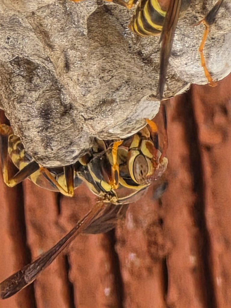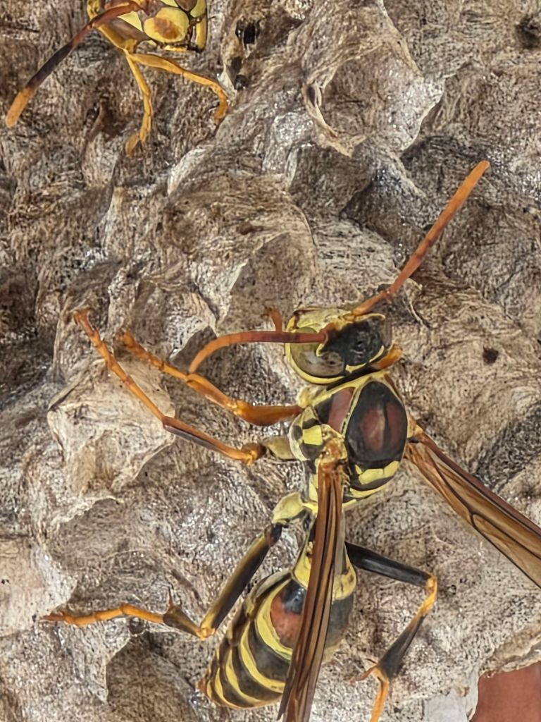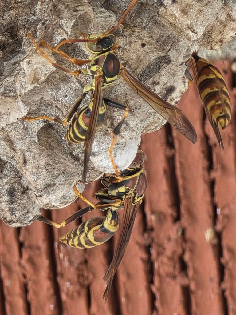 Paper wasps are fascinating insects known for their distinctive umbrella-shaped nests and important ecological roles. These wasps are reddish-brown to black in color with yellow markings and have long legs that dangle during flight. They’re typically 0.6 to 1 inch (15-25 mm) in length. Paper wasps are social creatures that live in colonies and are known for their complex social hierarchy, which includes a dominant queen, worker wasps, and males.